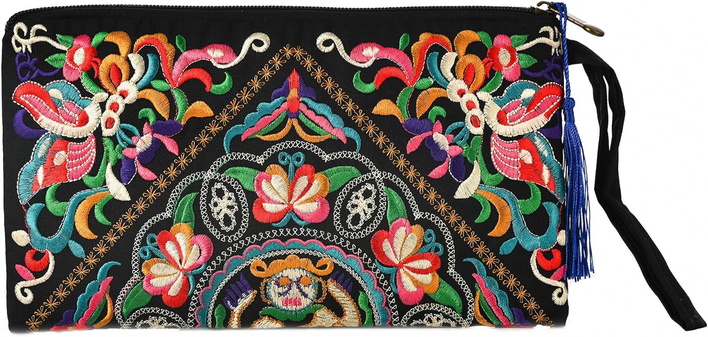 Floral Embroidered Boho Wristlet Women Girls Evening Clutch Bags Handbags Handmade Beach Bag With Lanyard