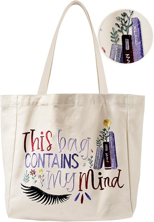 Aesthetic Embroidery Tote Bag for Women - with Magnetic Buckle and Zipper Inner Pocket for Lady Cotton Tote Bag